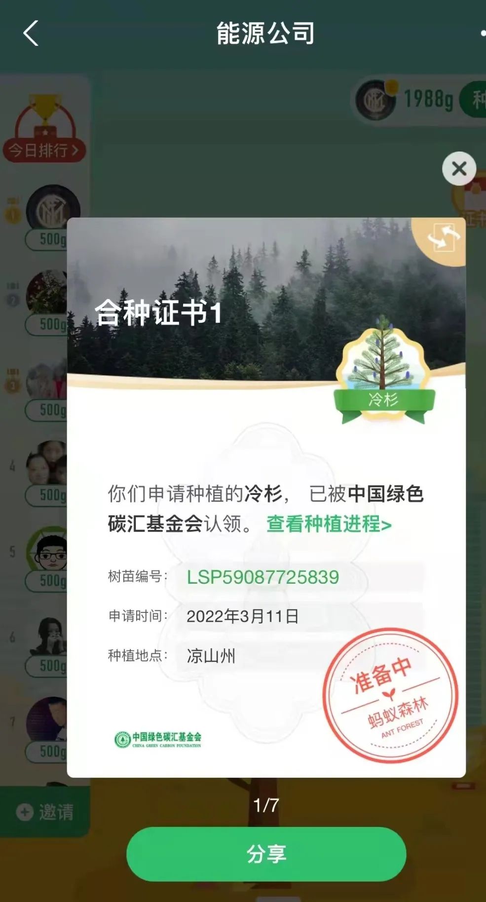 “一花一草皆生命,一枝一葉總關情?!痹缭?019年起,公司就通過支付寶螞蟻森林組建了一只“能源公司云種樹小隊”,如今隊伍人數越來越壯大,已有59位隊員,截止目前,在酒泉、大理、邯鄲等地,種下了冷杉、側柏、云杉、胡楊等7棵大樹。3月11日,在小伙伴的共同努力下,我們又種下了一棵冷杉樹,該樹被中國綠色碳匯基金會認領,將種植到涼山州地區。